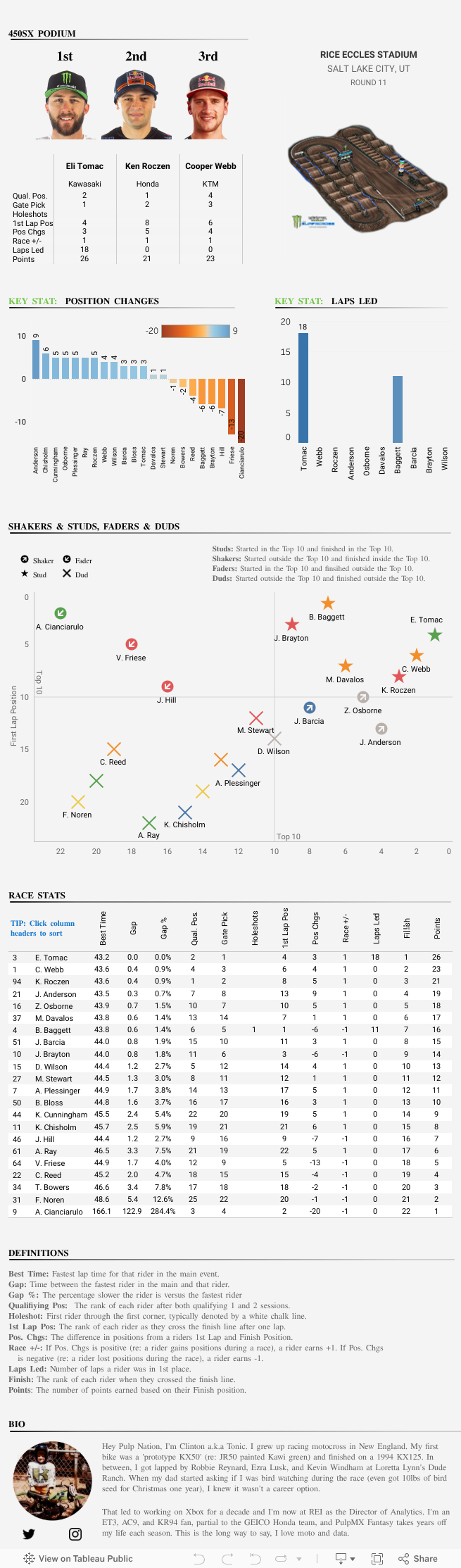 - Happy to hear Adam Cianciarulo’s injuries aren’t too bad. That looked brutal and could’ve been so much worse. He’s got a season total -31 position changes, 2nd worse behind Vince Friese’s season leading -45. Hopefully we see this improve over the final 6 rounds.