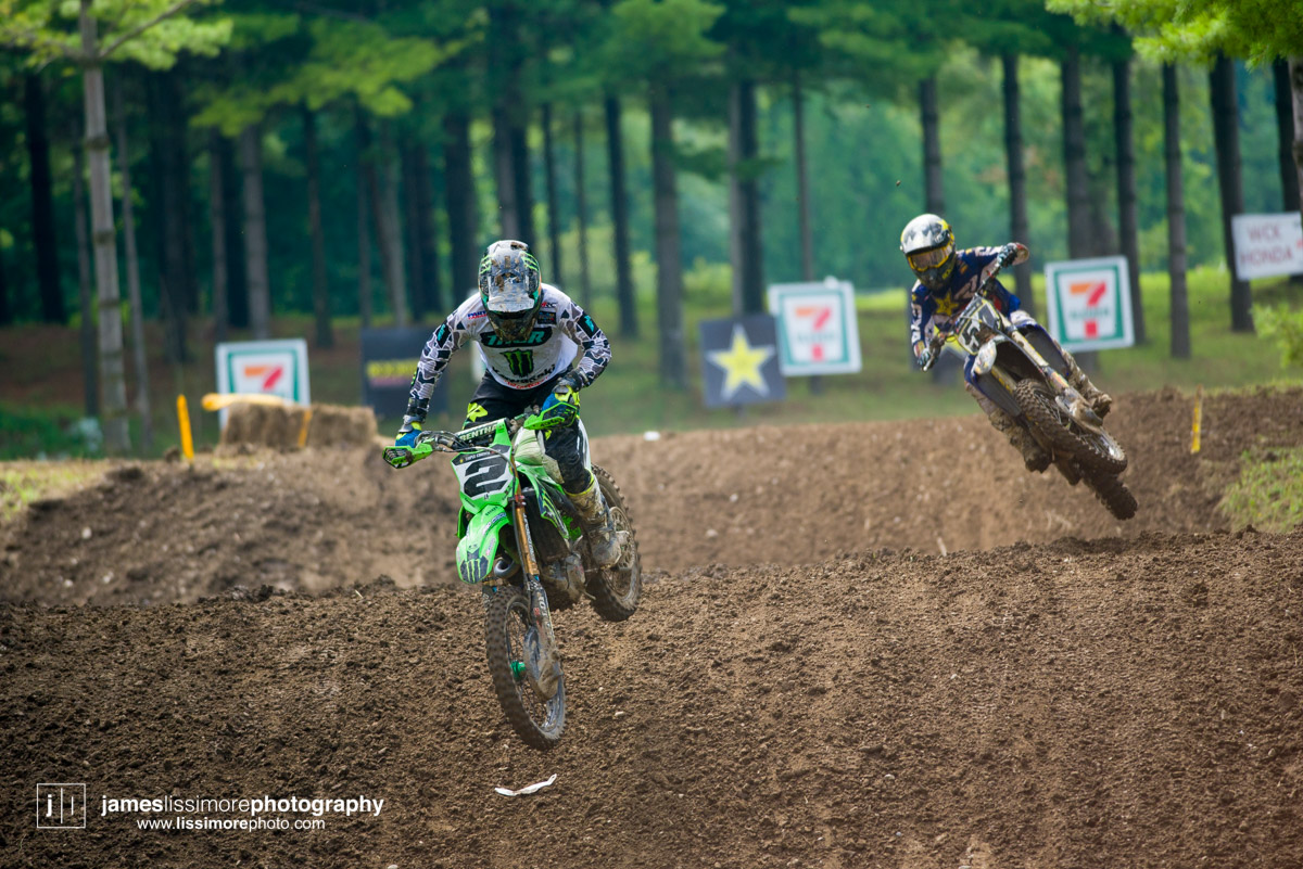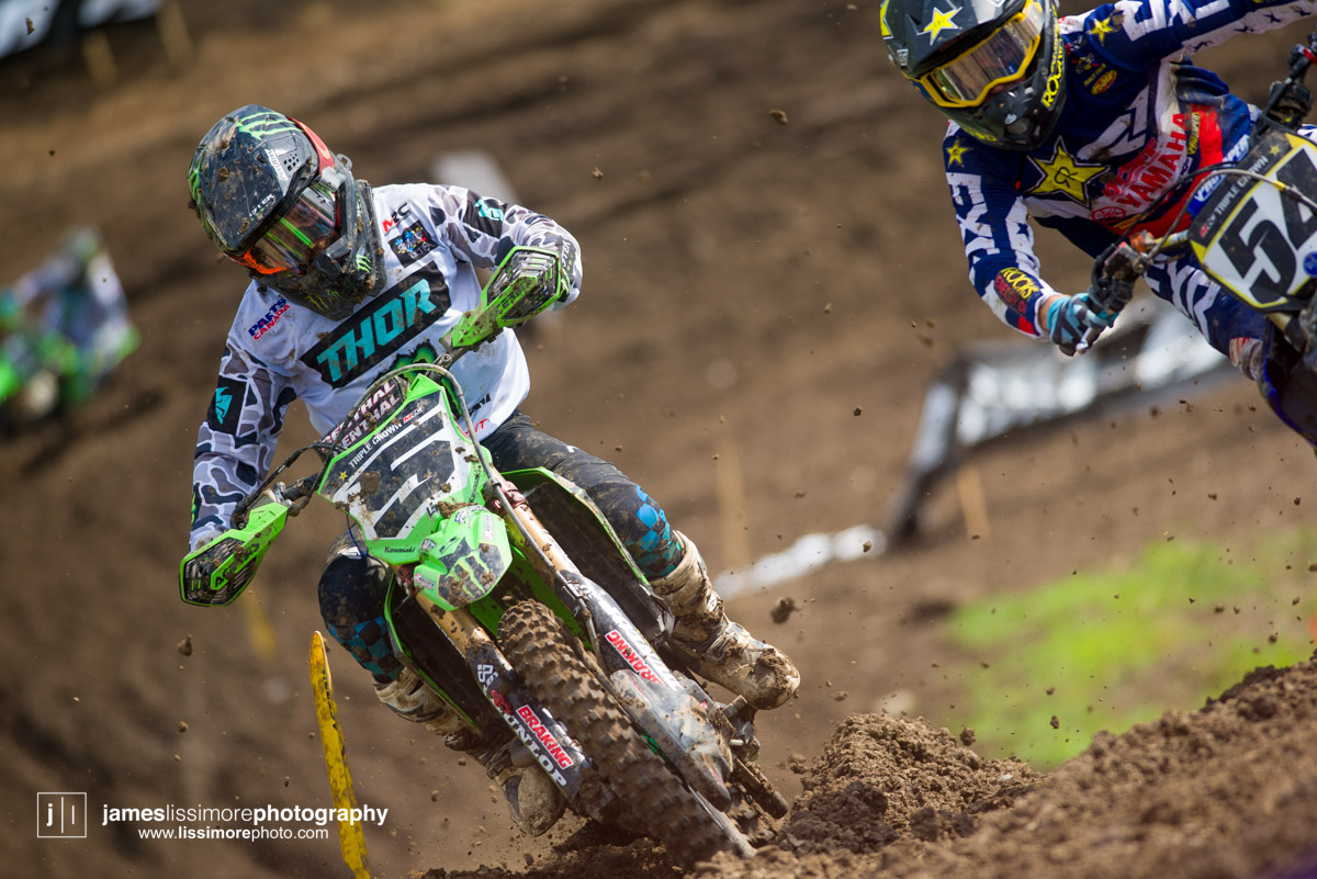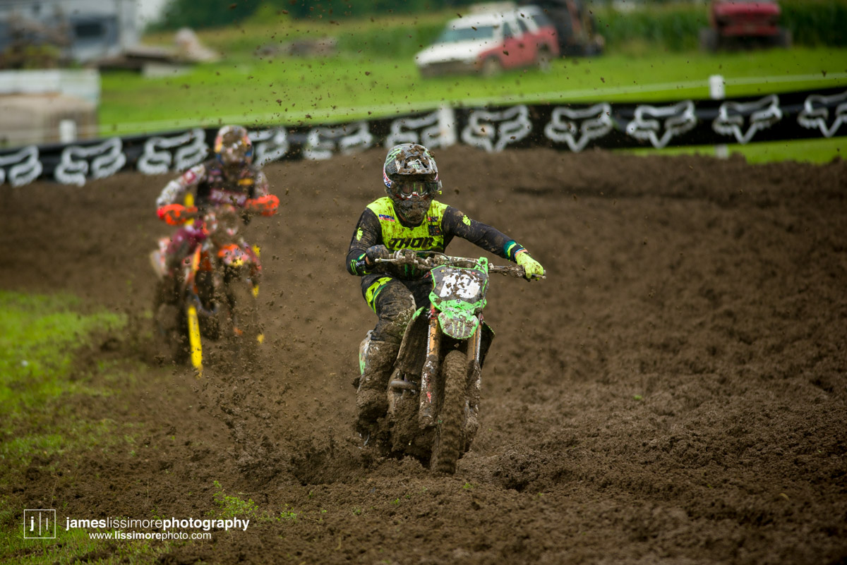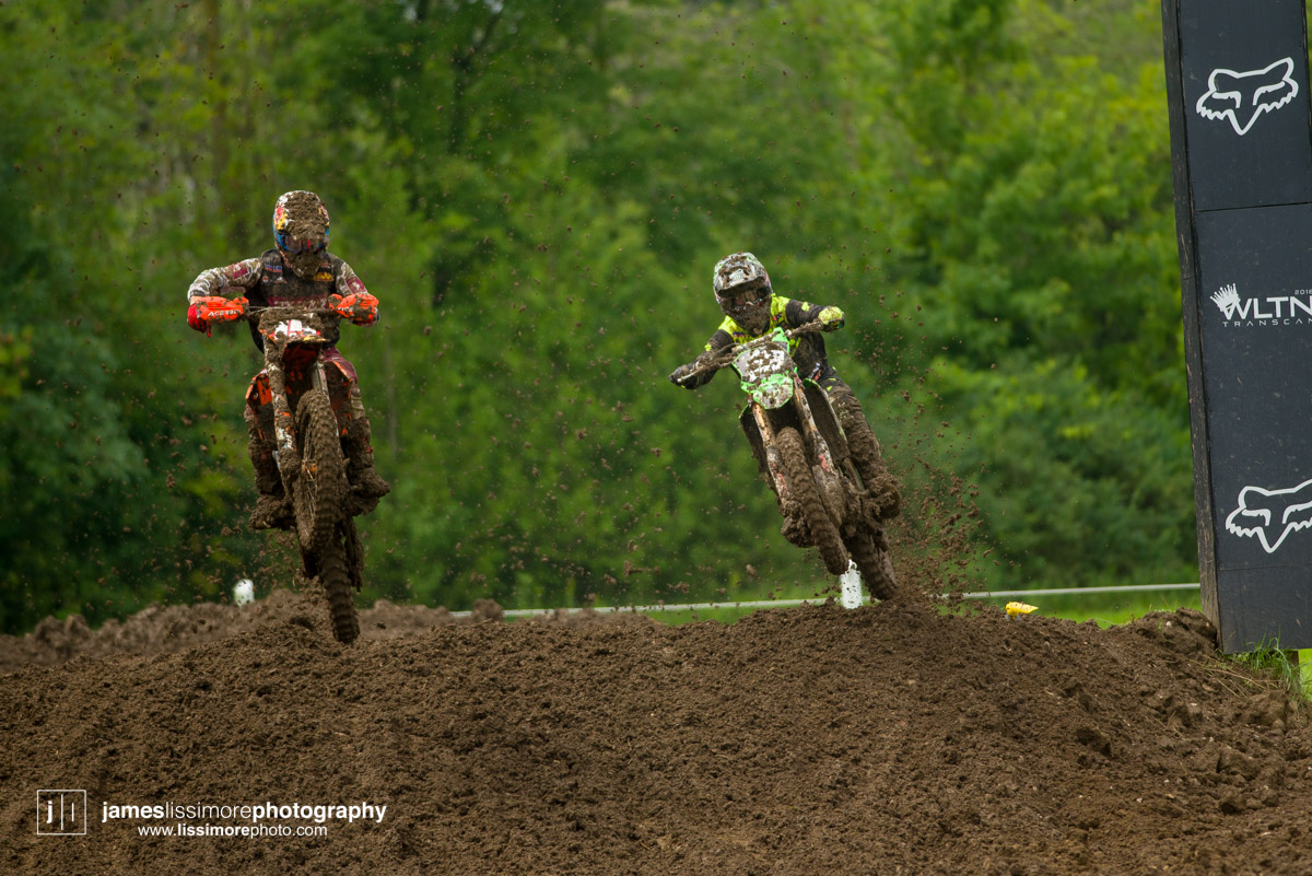 The best battle we’ve seen so far in this shortened season was Sunday’s first 250 moto in the mud. Marshall Weltin had the early lead with Pettis giving chase. The points leader caught and made the pass on Weltin but Weltin answered right back, taking the lead back.