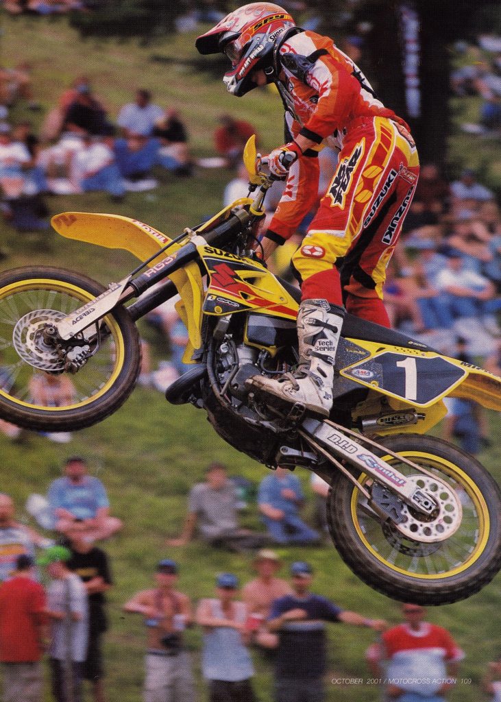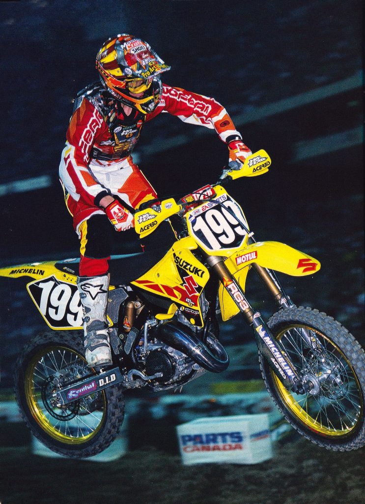 Suzuki superstar Travis Pastrana piloted the all-new RM125 to his first and only 125 Supercross title in 2001. Photo Credit: Kinney Jones