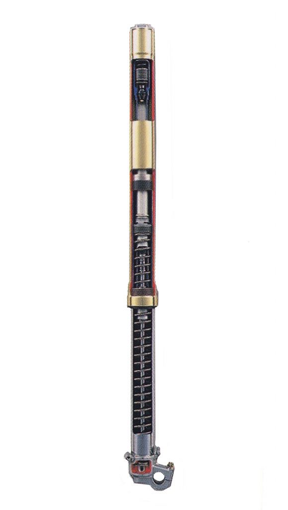 An all-new fork for 2001 offered a smaller outer diameter, lower weight, and revised internals. Photo Credit: Suzuki.