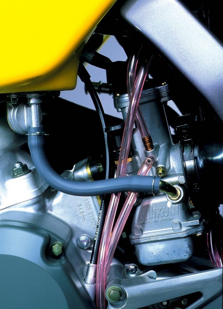On the motor side, Suzuki scrapped the outgoing mill completely and went with an entirely new design. To make the motor more compact, Suzuki moved the water pump back to outside the cases for the first time since 1998. This allowed them to shorten the overall length of the motor by 21mm and made servicing the water pump easier. The new motor maintained the case-reed configuration it had employed since 1989 but added an all-new cylinder that featured 3 degrees less tilt than in 2000. This was done to allow a straighter shot from the carburetor to the intake. Feeding that intake was an all-new Mikuni TMX38S carburetor that dropped the PowerJet used on the 2000’s Keihin mixer. The new carb was 104 grams lighter than in 2000 and featured a 14mm shorter body to increase intake velocity.