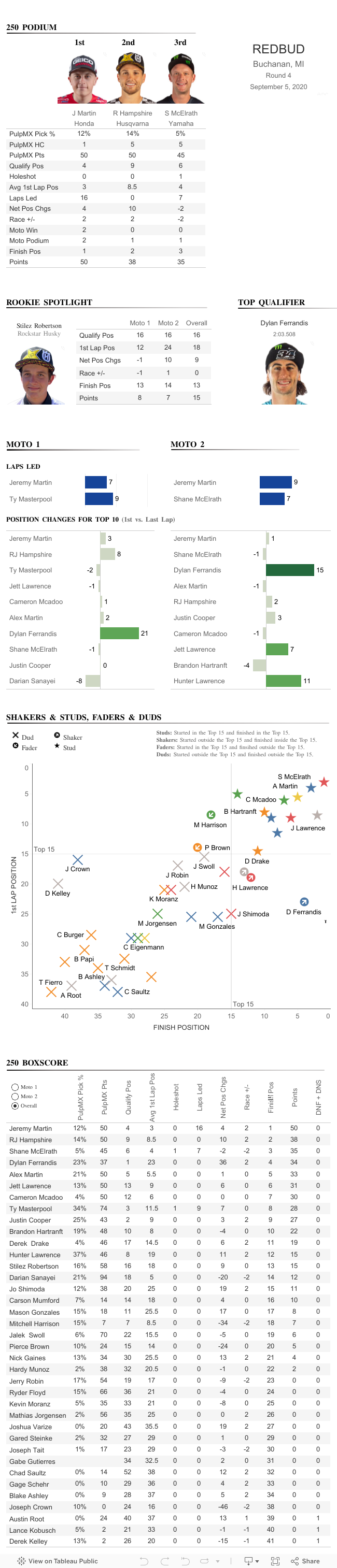 In the 250’s, Dylan Ferrandis was once again the fastest rider on the track, but the veteran Jeremy Martin took both moto wins along with the overall and now leads the championship by +12 points. Interestingly, both Jeremy Martin and Dylan Ferrandis are the only two 250 riders with a perfect +8 Race +/-. They both have the most moto wins with 3 as well. The difference is that Jeremy Martin’s average first lap position is 3rd while Dylan Ferrandis’ is 14th and that’s resulted in Jeremy Martin winning 3 of the 4 overall wins. Check out the stats below for a note on Ferrandis ‘season of passing’.