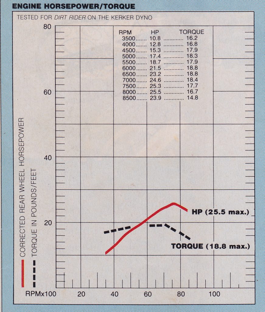 The stock TT350’s 25.5 horsepower was less than what strong-running 125s like Honda’s CR produced in 1986. Just as today, however, it was the four-stroke’s strong torque advantage that told the true story. Here, the 350’s super flat torque curve gave it a rideability advantage over the peakier but more powerful two-strokes. Photo Credit: Dirt Rider