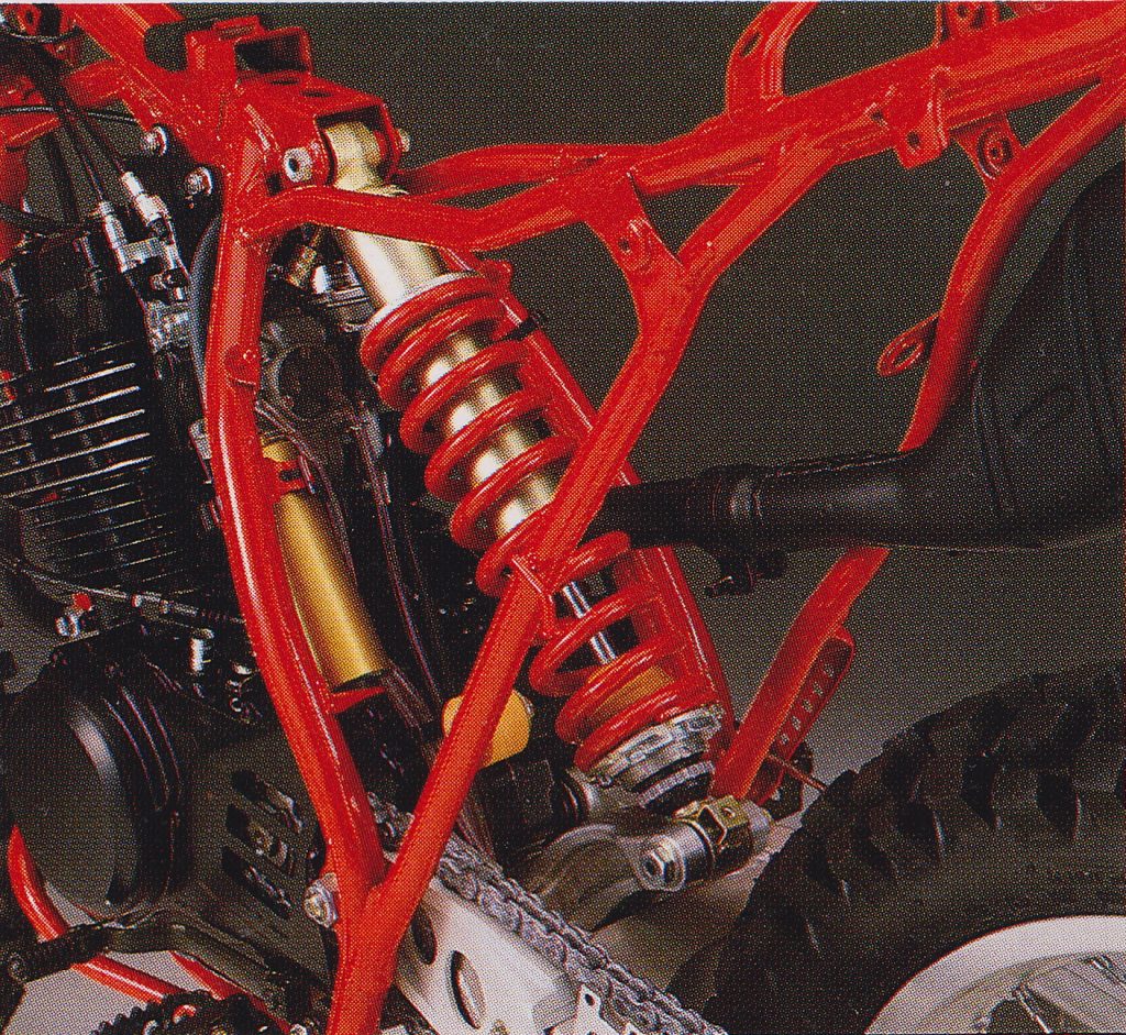 The rear suspension on the new TT350 used a single Showa damper mated to an older version of Yamaha’s Monocross linkage system. Photo Credit: Yamaha