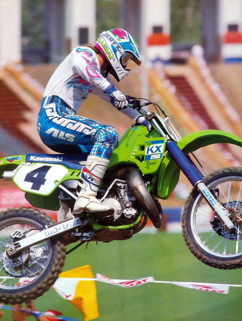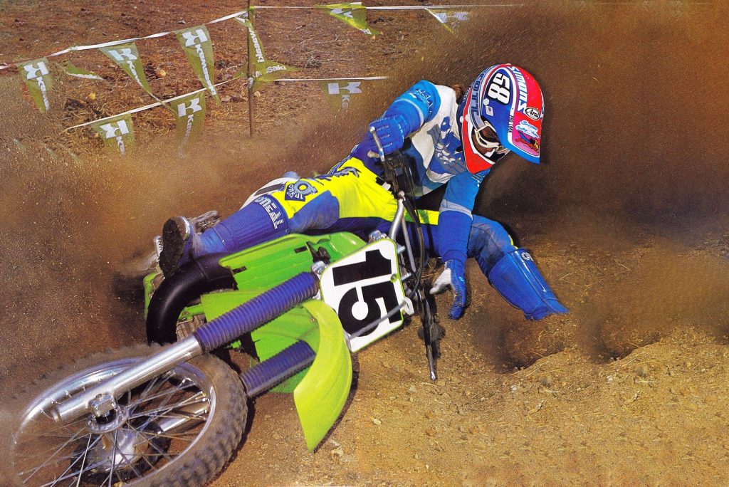 Factory Kawasaki’s Jeff Ward used the all-new KX250 to race to his second 250 National Motocross title in 1988. Photo Credit: Kinney Jones