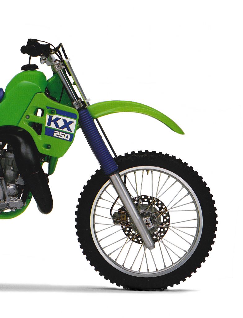 The new 43mm Kayaba cartridge forks for 1988 improved the KX’s suspension performance ten-fold over 1987. While not as perfectly damped as the units found on Suzuki’s RM250 they were easily the best forks ever offered on a green machine. Photo Credit: Kawasaki