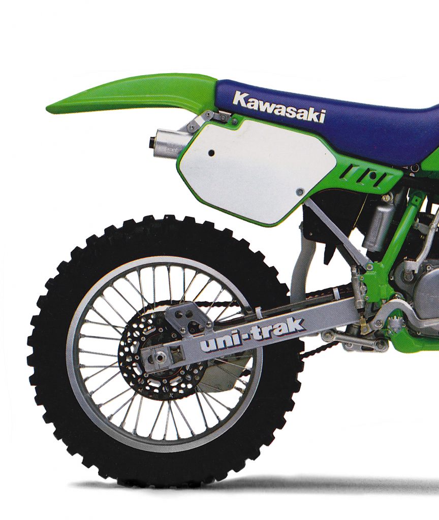 The new Uni-Trak rear suspension for 1988 did not prove to be as effective on the tracks as the updated forks. Harsh and prone to packing, the KYB shock needed a re-valve if you hoped to get the most out of your new KX250. Photo Credit: Kawasaki