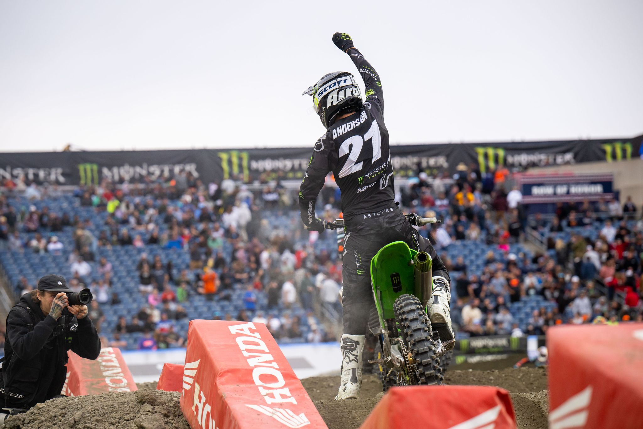 Jason Anderson: After walking the track after the 450 main event I can see why JA succeeds in these conditions. Slippery conditions with technical lead ins coming into corners! JA can make up a lot of time because he rides with his legs a ton and this track lead itself to riders who can rear steer as well as use their legs. Jason is fun to watch ride! Impressive to get two in a row!