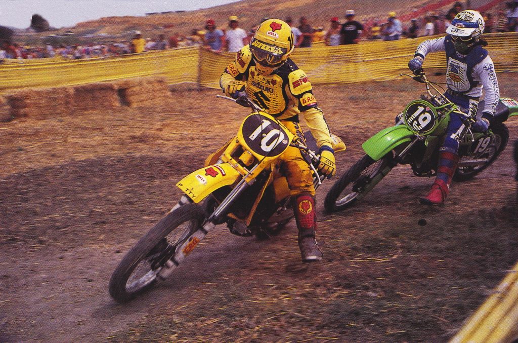 Suzuki’s Mark Barnett (10) had Jeff Ward (19) and the rest of the 125 class covered in 1980. Photo Credit: Motocross Action.
