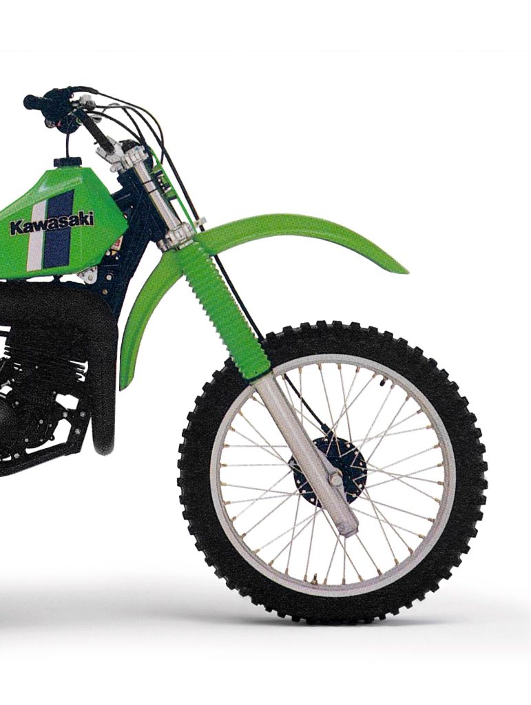 Up front, the new KX’s 38mm Kayaba forks offered a similarly plush ride that won over testers in 1980. In spite of offering less travel than its rivals, its action was rated ahead of them by most testers who found its supple action an excellent match to the Uni-Trak rear. Bottoming was not a major issue but some fast guys found their action a bit soft overall. For them, raising the oil height slightly and adding a few pounds of pressure in each leg would firm up the action enough to be acceptable. While not as unanimously loved as the shock, the KX125’s front suspension was still rated as one of the best available in 1980.