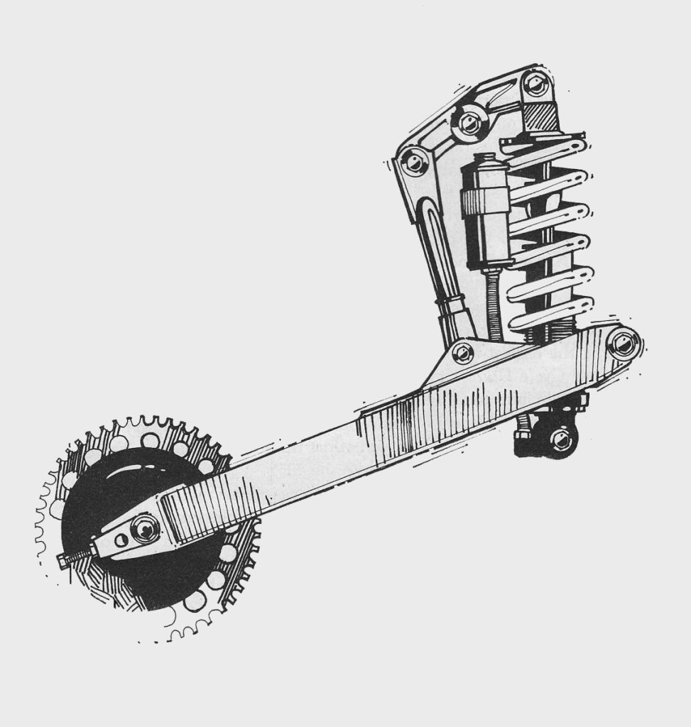 The key component to Kawasaki’s new Uni-Trak system was the large bell crank linkage arm that compressed the single KYB damper. While this first version lacked the rising rate linkage curve of later designs, it still provided a significant step forward in performance over the traditional dual-shock systems of the time. Photo Credit: Kawasaki