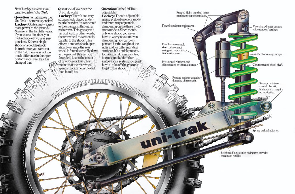 When compared to a traditional dual-shock arrangement, the new Uni-Trak also offered several advantages. Ergonomically the move to the single shock allowed Kawasaki to significantly slim the midsection of the KX. The adoption of a single shock also alleviated any issues that might arise from having production variances in two individual shocks. If two shocks were far enough apart in their individual damping, they could actually work against each other and adversely affect the suspension’s performance. By placing the shock vertically, the damper was also put under less stress on hard impacts. This in turn should have resulted in improved reliability and longer-lasting performance.