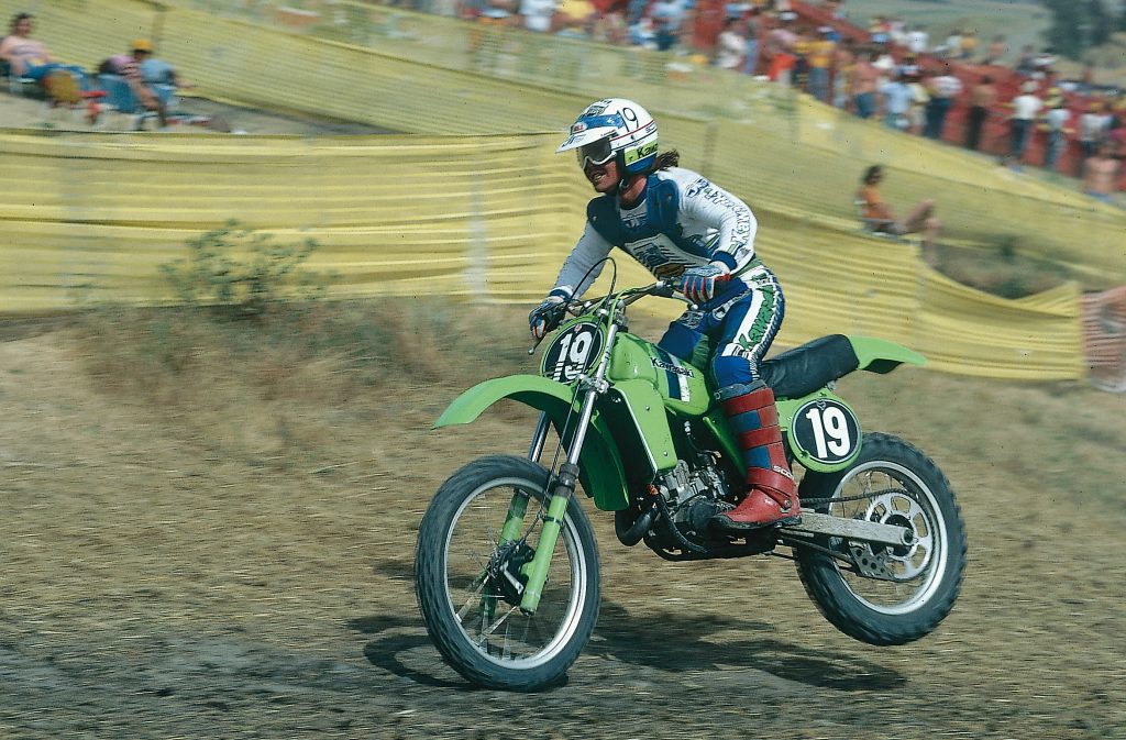 With able handling and excellent suspension the 1980 KX125 was capable of generating competitive lap times but it took a talented rider like Jimmy Weinert to make the most of its narrow power spread. Photo Credit: Dirt Bike