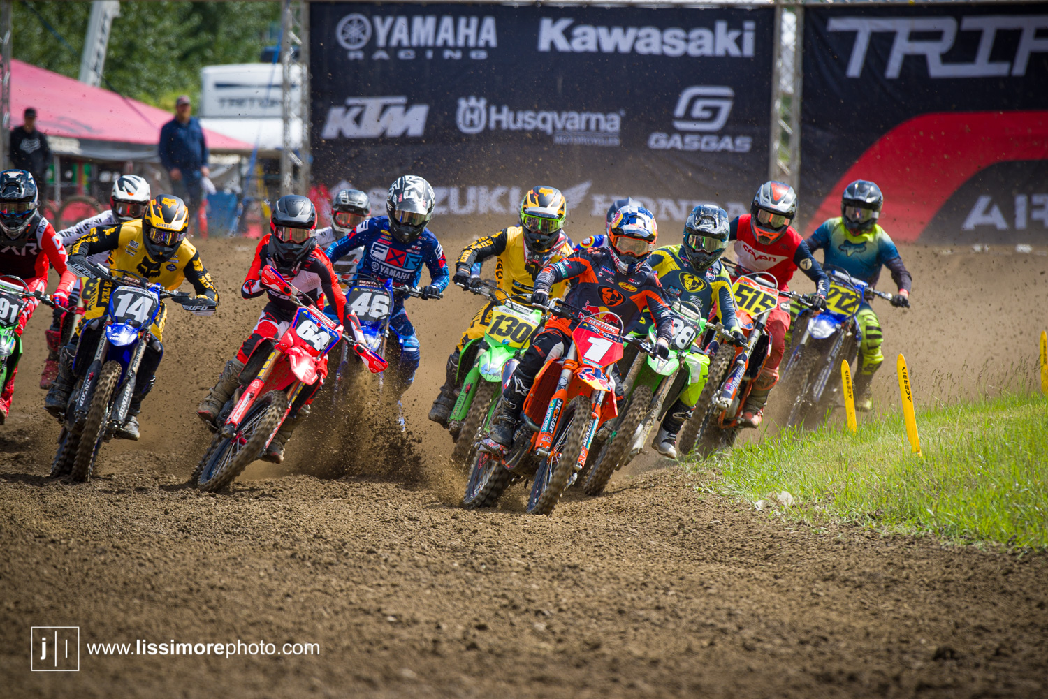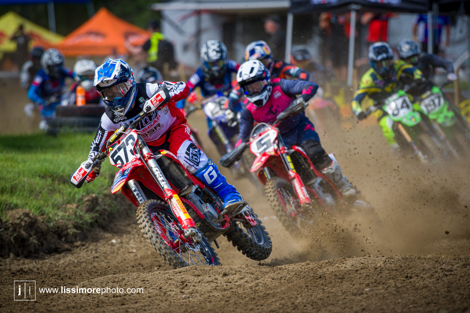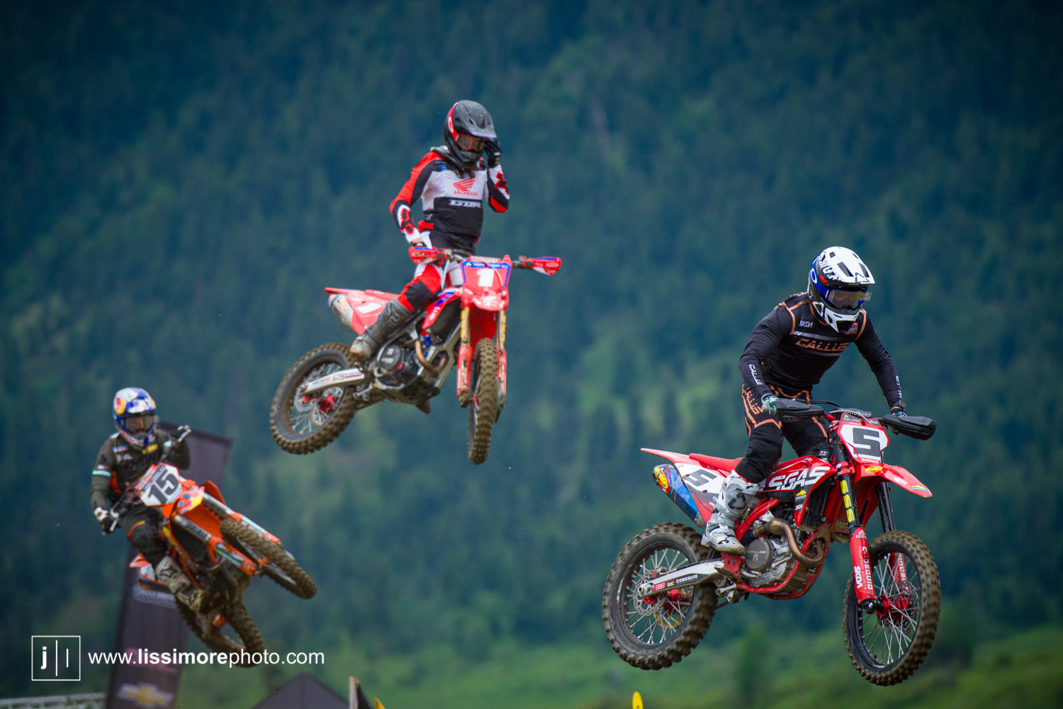 Tyler Medaglia(5), Dylan Wright(1) and Jess Pettis(15) occupy some crowded airspace early in moto one.
