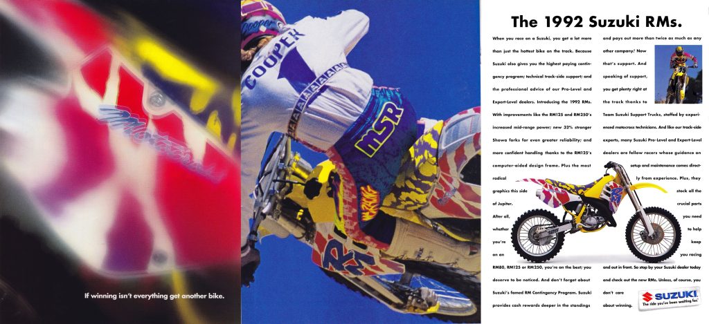 Say what you will about the styling, it would certainly be hard to ignore this three-page ad when you opened your new issue of Motocross Action. I’m not sure how many people liked the RM’s new look at the time (I certainly didn’t) but there can be little doubt that it helped the bikes stand out in the showroom. Photo Credit: Suzuki