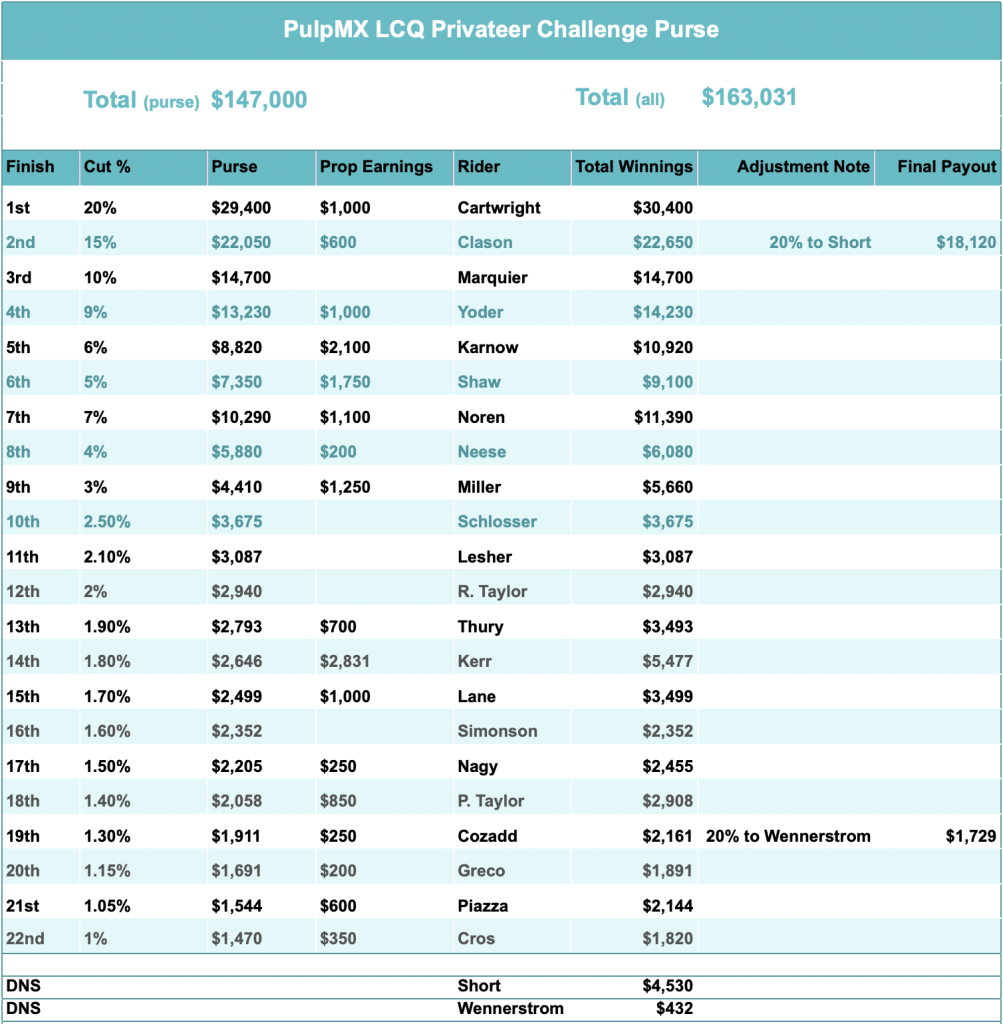 Thank you to all you fans who chipped in your hard earned cheddar to both help the Privateer racers and get a shot at winning some incredible prize packages including a 2023 Yamaha Yz450. Of course thanks to Yamaha as well and all the partners who offered packages to sweeten the pot for fans to get involved. Thank you as well to Vurb Moto and FXR for the help with getting the Livestream of the race handled.