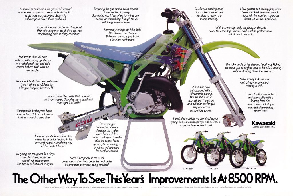 After only two years on the market, Kawasaki revamped their KX125 and KX250 for 1992 with a huge list of updates. Photo Credit: Kawasaki
