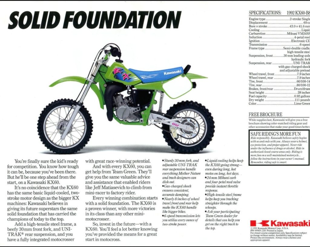 With the KX80, KX125, and KX250 receiving major updates for 1992, it was left to the KX60 and mighty KX500 to soldier on unchanged aside from some graphical changes. As the only Japanese 60 still in production, the KX60 remained stuck in a 1985 time warp. After vanquishing the CR60R, RM60, and YZ60 the KX was left without competition and Kawasaki no longer seemed to feel the need to update their pint-sized rocket. After its move to liquid cooling in 1985, the KX60 remained unchanged aside from Bold New Graphics for nearly two decades. For 1992, Kawasaki kept the status quo for their mighty mini with BNG being its only notable update.