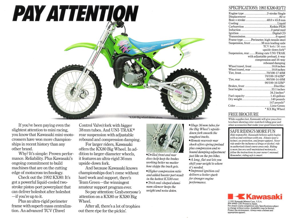 In a class known for slow-moving technology, the KX80 was at the cutting edge of design in 1992. Its stout perimeter frame and trick inverted forks (on the Big Wheel version) allowed skilled riders to push harder and fly higher than many of its competitors. Photo Credit: Kawasaki