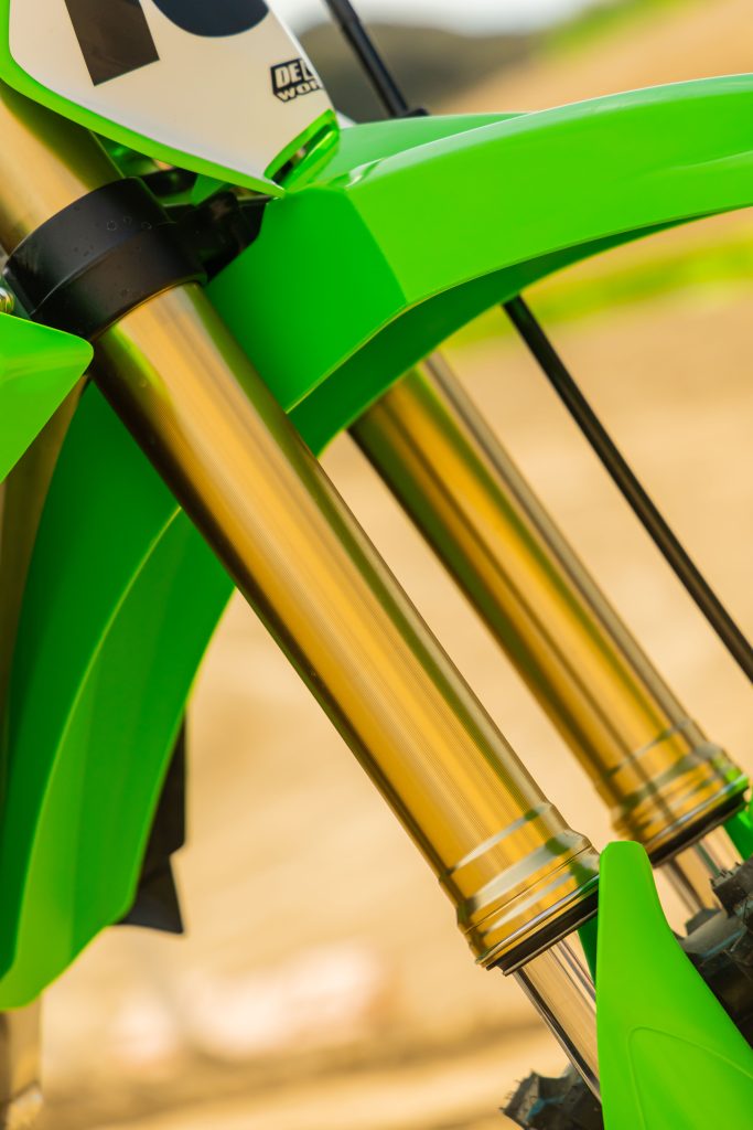 Stock Suspension Feel: The spring rates have not changed for 24’ but the valving was beefed up from my understanding. The Showa fork has broken in now (with 6 hours on it) and is a little soft, yet there isn’t a lot of pitching off throttle so getting the bike to remain flat coming into corners is a welcome attribute to the 24’ KX450 (unlike the 23′). I do think that the Showa shock is a little firm in the mid stroke so you might feel like the rear is overpowering the fork a bit at times. I weigh around 175 pounds and would like a little more comfort on de-cel bumps with the shock so I will be playing with settings as we go. I either feel I need to go heavier on fork spring or possibly back off some mid speed compression (inside the shock). Compared to the 23’ however the 24’ Showa set up is much more balanced and allows the bike to work better straight out of the box. Oh and by the way you can’t swap out your 23′ shock with the 24′. The 24′ Showa shock is shorter than the 23′ and the reservoir is on the opposite side from last year. Forks, triple clamps, wheels, fuel tank and seat are interchangeable between old/new bike.