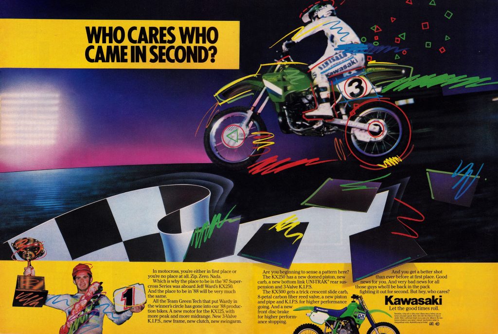 This ad for the all-new 1988 KX250 touts Jeff Ward’s Supercross championship victory in 1987 but the two machines could not have been more different. In 1987, the KX250 was a slim and sleek tractor of a machine with razor-thin ergonomics, disappointing suspension, and the most grunt in the class. The KX blasted out of every turn with instant power but the chassis and suspension were far from the best in the class. For 1988, Kawasaki scrapped every component of the 1987 machine in favor of an all-new design and upped the technology in the motor and suspension. Like the Yamaha, the new Kawasaki finally copied Honda by going to a sophisticated cartridge damping system for its 43mm Kayaba forks. The motor gained an additional valve in the KIPS system and the frame featured new geometry and stronger construction. Of all the changes made for 1988, however, the most controversial was the KX’s redesigned bodywork. In 1987, the KX had featured the slimmest ergonomics in the class, but for 1988, Kawasaki went plus-sized with a porky layout that made the machine feel more like an Open class machine than a lithe 250. Kawasaki’s reasoning for this was that some riders (notably Kawasaki factory rider Ron Lechien) felt the old bike was too thin and this made it difficult to hold on to in the rough. While tall riders like Lechien may have liked the beefy new dimensions, not everyone else was a fan of the heftier feel. Aside from the big boy bodywork, the KX was a much-improved machine. The new triple-valve KIPS motor was an absolute rocket and Kayaba suspension was much improved. There was still a little mid-stroke harshness to the forks and the handling was rather milk toast, but the Kawasaki was a very competitive machine as long you could come to terms with its 500-class feel.