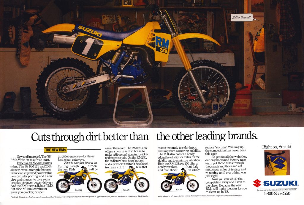 Suzuki fell on some really hard times in the mid-eighties with a run of sub-par machines that failed to live up to the excellent reputation they had established in the late seventies. Even the RM’s once impeccable reputation for suspension excellence came into question with the retirement of the original Full Floater design in 1986. That same year, Suzuki hired motocross legend Bob Hannah away from Honda and he set about righting team Yellow Magic’s trouble motocross program. In 1987, the introduction of a more conventional bottom-link rear suspension system and a redesigned motor brought the RM250 back from the brink of irrelevance, but its oddball ergonomics and quirky construction continued to limit its appeal. In 1988, Suzuki updated the ergonomics with a new tank that lowered the radiators a full two inches and slimed up the pilot’s compartment. Suzuki also cured the stalling problems of 1987 with a new Mikuni “Slingshot” carburetor that improved response and finally added an idle circuit. These changes and some additional motor tweaks added up to a much-improved machine. The RM’s motor and suspension were excellent and the new tank gave the bike a more modern feel. The rest of the bodywork remained slightly cobby, but overall ergonomics were no longer a handicap and many felt the revamped RM250 was the best overall machine available in 1988.