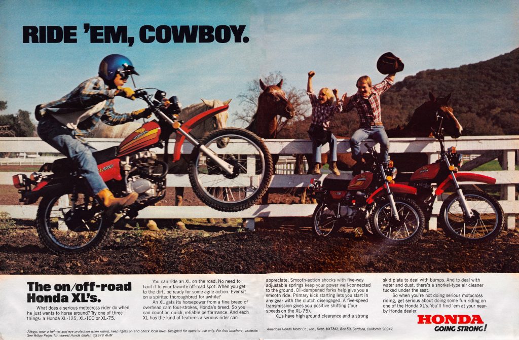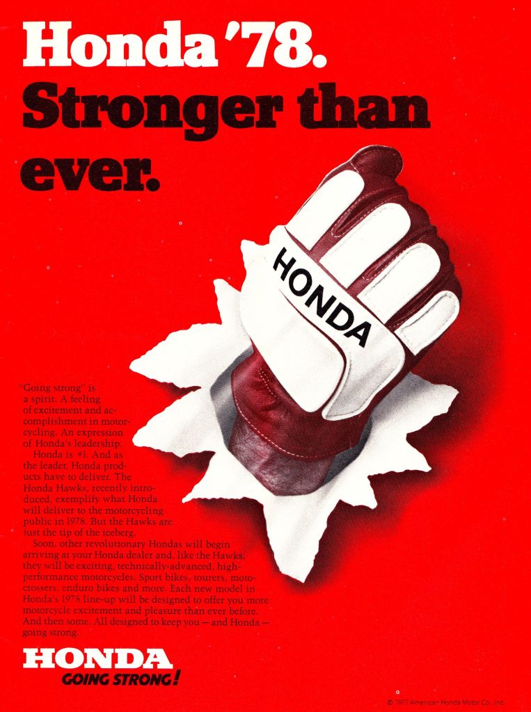 Honda’s “Going Strong!” ad campaign for 1978 projected a great deal of positivity about the new products coming down the Big Red pipeline. Photo Credit: Honda