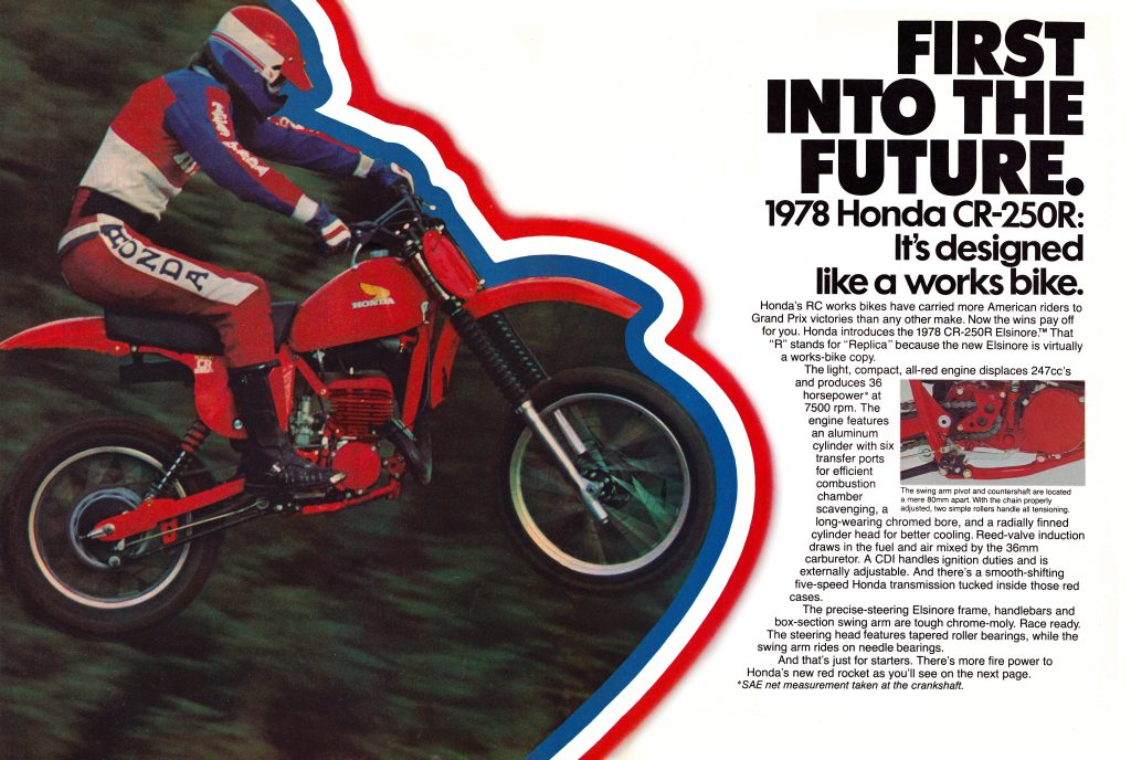 All-new for 1978, the redesigned CR250R Elsinore pointed the way forward for Honda’s motocross development. Ultra-long-travel suspension, eye-watering power, and works styling propelled the CR from also-ran to top dog in 1978. Photo Credit: Honda