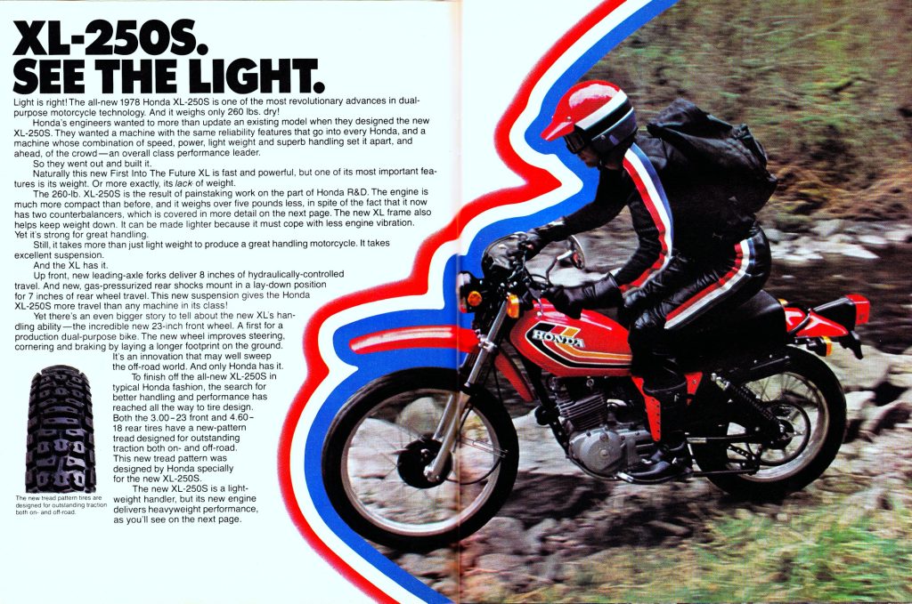 Honda XL250S was all-new for 1978 with a redesigned long-travel chassis, high-tech four-valve motor, and revamped bodywork that hinted at the look for the all-new XRs that would debut the following year. Photo Credit: Honda