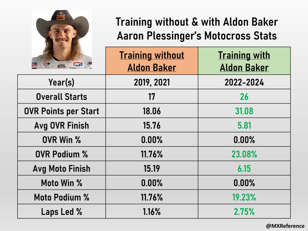Aaron Plessinger’s number drastically improve while training under Aldon Baker. AP has been far more consistent when training with Baker as well.