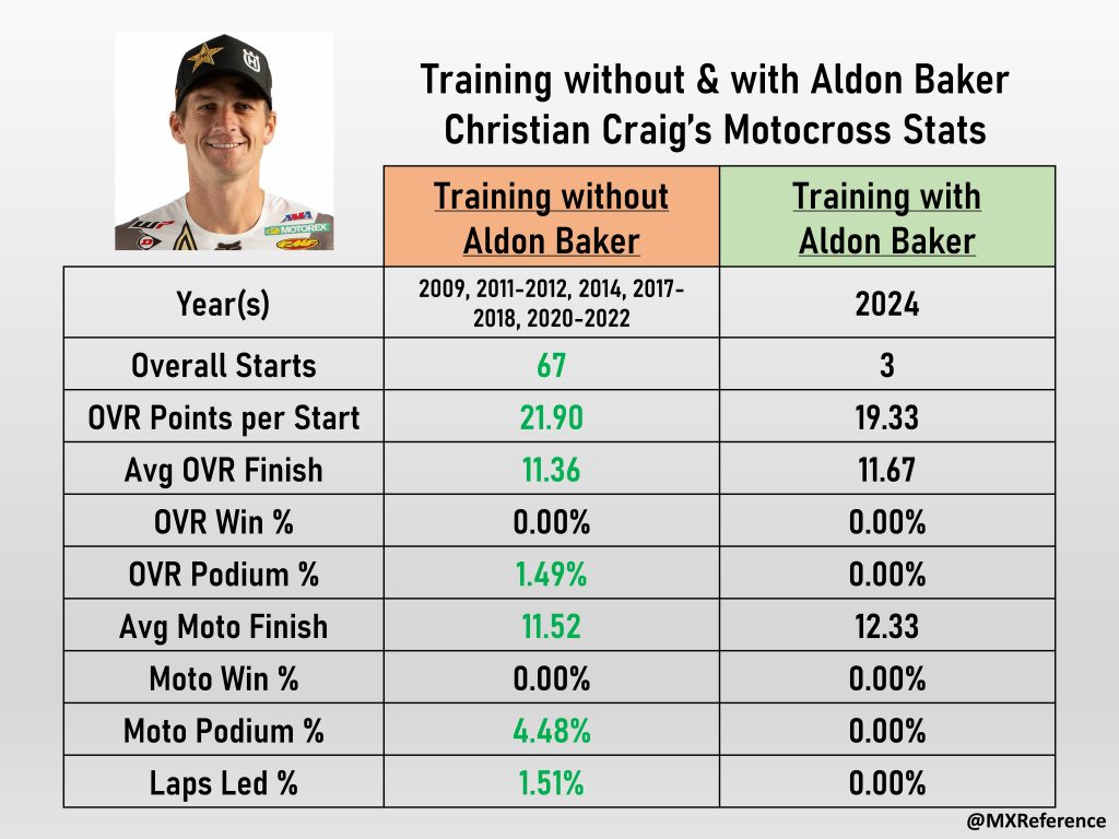 As of this writing, Christian Craig only has three races with Aldon Baker so far, so its pretty impossible to compare anything here. Didn’t realize how many 450 Motocross races Craig has competed in over the last 15 years though.