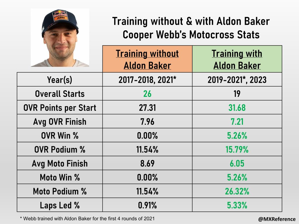 Cooper Webb has a good amount of races to compare. Unlike Anderson whose stats were slightly better without Aldon Baker, Cooper Webb’s are slightly better with Aldon Baker as his trainer.