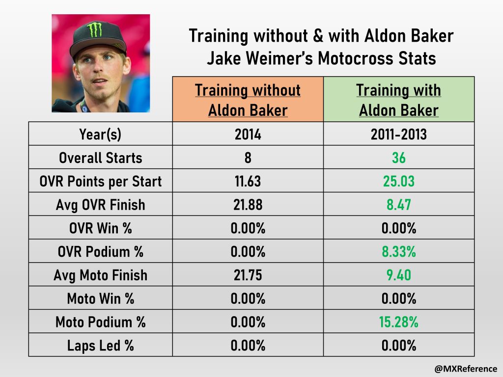 Jake Weimer only had 8 career 450 motocross races without Baker – another small sample size unfortunately. Weimer raced professionally through 2018, but didn’t race Pro Motocross after 2014.
