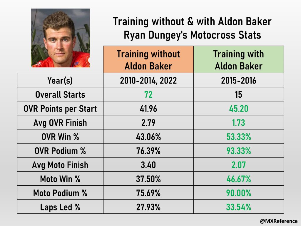 Ryan Dungey spent his first 5 outdoor seasons without Aldon Baker. In 2015, he started training with Baker and won the title in 2015 and raced a few rounds in 2016 before injury. Once again a small sample size to compare (don’t worry there are two riders coming up with a lot of races with and without Baker!). Dungey’s 2022 comeback season stats are included in this. If you are wondering if any of the stats would be better excluding 2022, only his moto podium % is higher. Even with how insanely consistent Dungey was in his career, he was even more consistent with Aldon Baker.