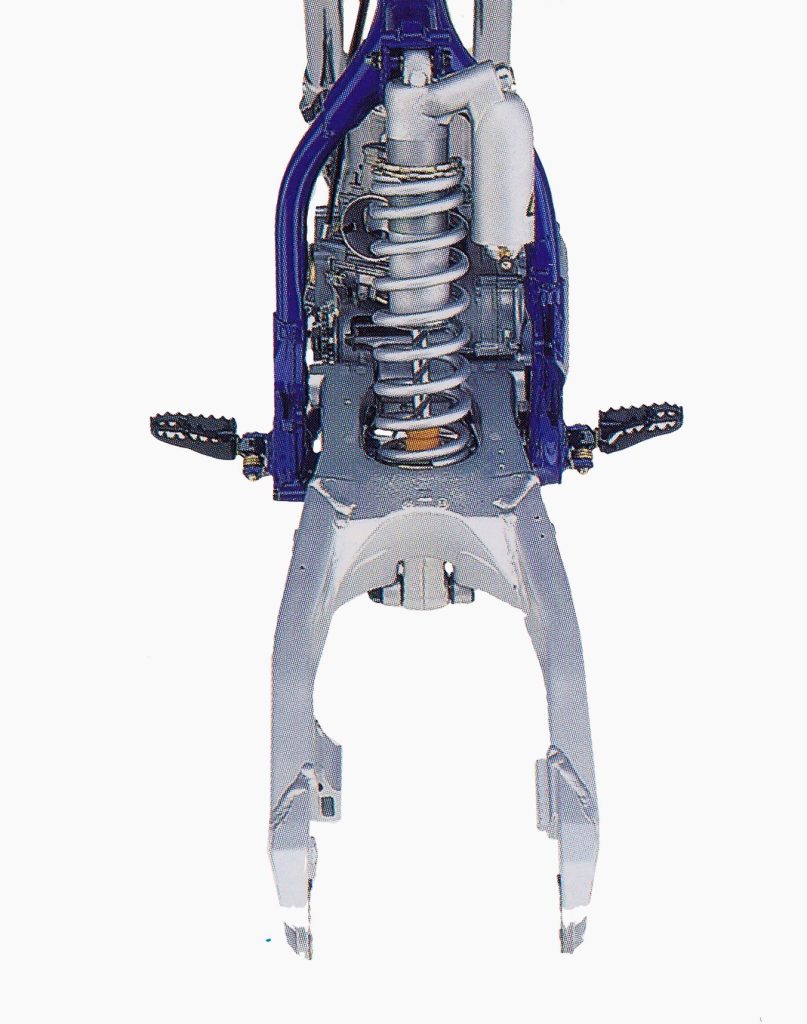 The most significant change to the YZ250’s chassis for 1999 was an all-new linkage and swingarm that repositioned the shock mount to be 12mm lower on the chassis and shaved half a pound on the scales. Photo Credit: Yamaha