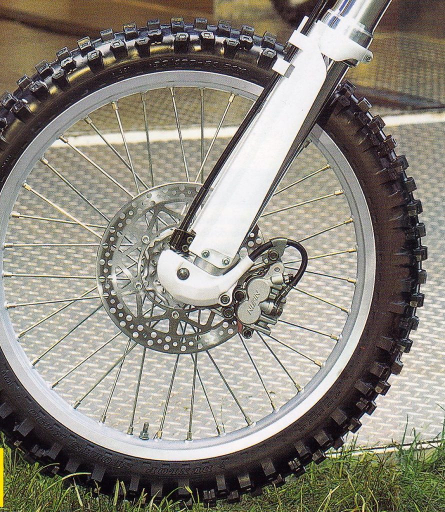 An all-new rear wheel for 1999 added Takasago Excel rims, larger spoke nipples, a redesigned sprocket mount, and a 2mm larger rear axle. Photo Credit: Motocross Action