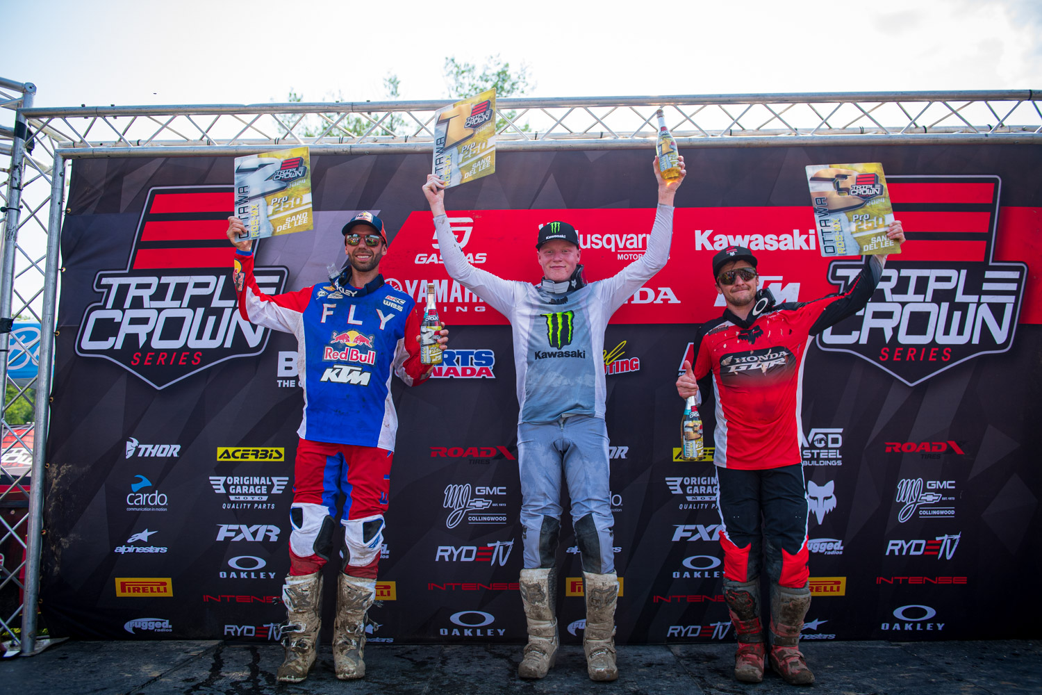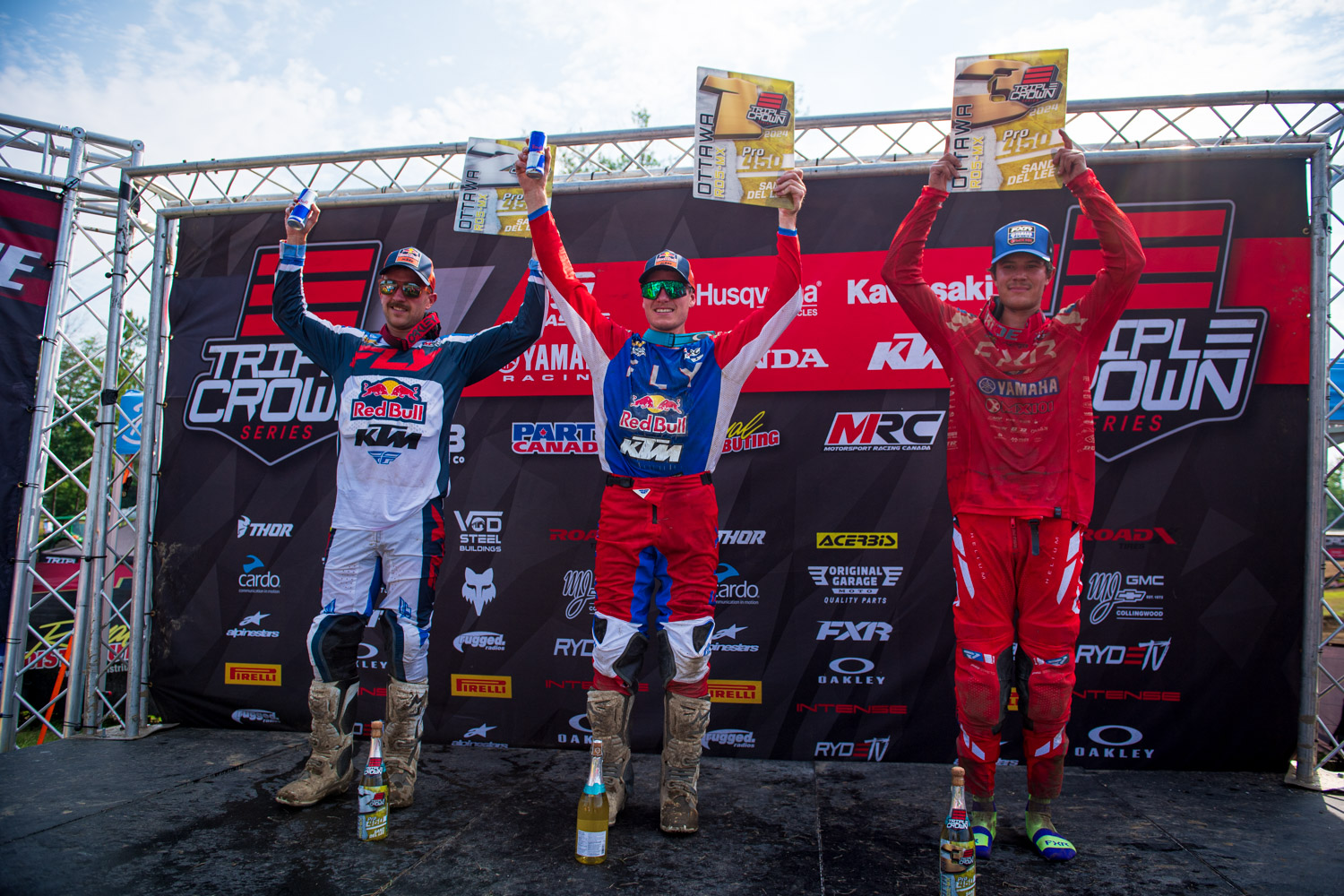 250 Podium – 1st Drew Adams, 2nd Kaven Benoit, 3rd Tyler Medaglia. Not sure what it says about the 250 class, but there’s 5 children between two of the three riders on the podium.