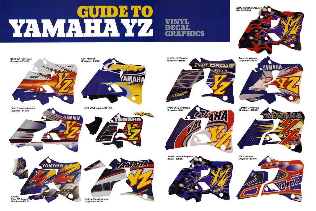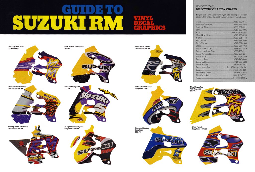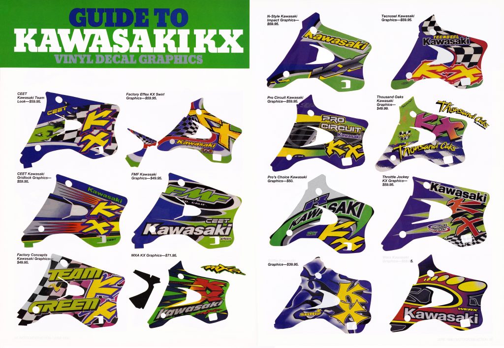 By the mid-nineties, the aftermarket graphic industry was in full swing with companies like N-Style, Factory Effex, Stiffie, MXA, Werx, and Pro’s Choice joining OG companies like 100% and Ceet. These new companies offered everything from OEM graphic replacements to complete kits to change the look of your ride. Even the factory teams got in on this trend, introducing unique color and graphic packages that looked nothing like the CR, KX, RM, or YZ you would find on the showroom floor. Some of these looks were awesome and some were just plain outlandish, but regardless of your taste, the aftermarket graphic industry had a look just for you.