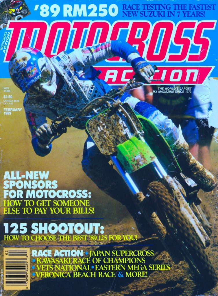 Longtime Wrecking Crew member and AMA pro Larry Brooks graces the cover of MXA’s 125 shootout issue for 1989. In 1988, Brooks raced a KX125 to 6th overall in the 125 National Motocross standings. Photo Credit: Motocross Action