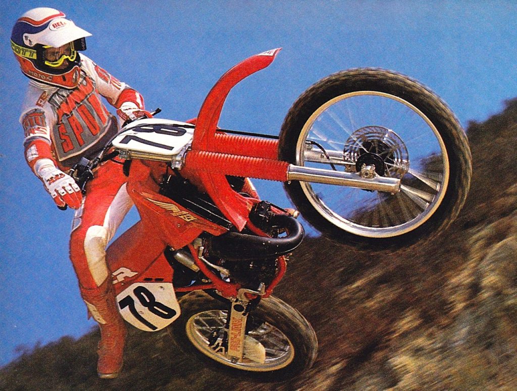 On the handling front, the KTM was rather unpredictable with excellent front-end traction on hardpack but a vague steering feel on softer surfaces. It was hard to trust the front end in sand and mud and the KTM was known to break into Honda-like fits of headshake at speed. Bigger riders appreciated its roomy ergonomics, but its large and tall layout made the KTM feel heavier and less nimble than the Japanese 125s.