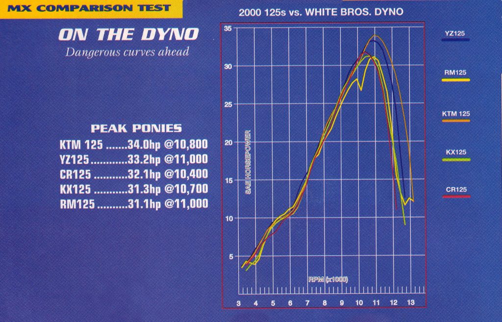 On the track, the 2000 RM125 once again proved to be a competitive if not class-leading machine. As in 1999, the Yamaha and KTM remained the powerhouses of the 125 class, and it was tough to overcome their power advantage. On the dyno, the KTM bested all comers with an output that outpaced even Yamaha’s broad and brawny YZ125. At its peak, the revamped RM gave up a 2.1 horsepower to the YZ and nearly 3 full ponies to the KTM. For many, that was all it took to knock the RM down in the final 125 standings.