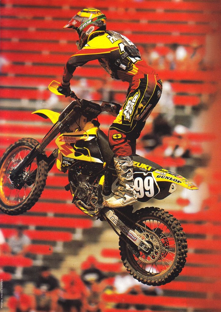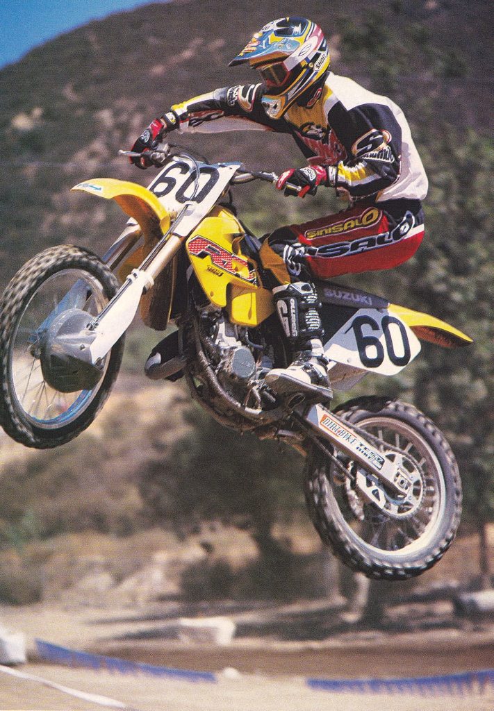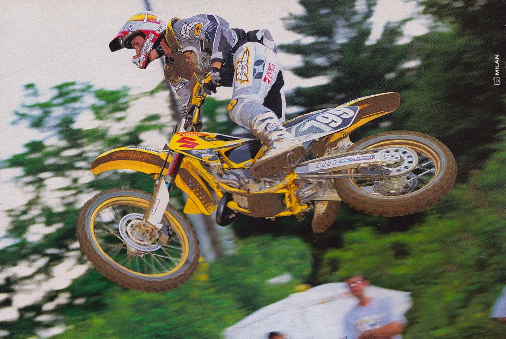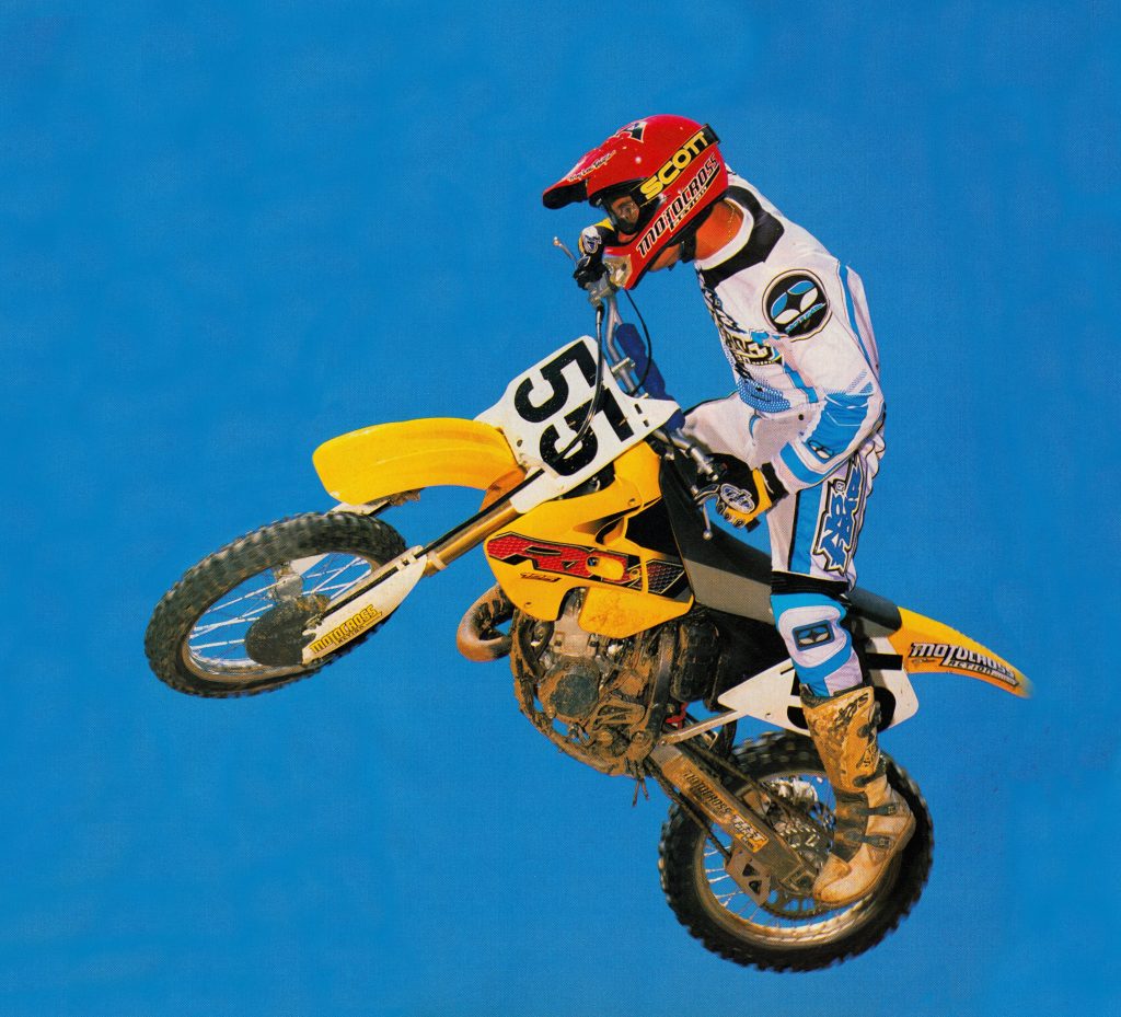 Going big and getting loose were the RM’s strong suit in 2000. Its compact ergos, slim midsection, and feathery feel made the Suzuki the ideal partner for Pastrana-style antics on and off the track. Photo Credit: Motocross Action