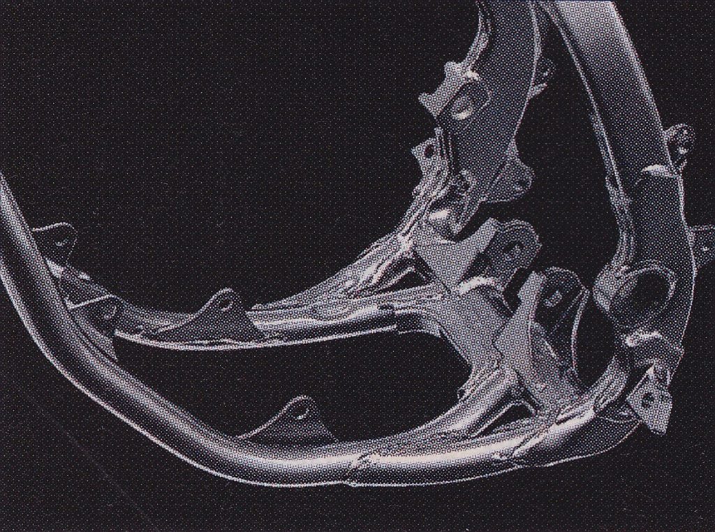 A new lower frame cradle for 2000 provided increased strength by adding additional gusseting and repositioned the main frame tubes closer to the linkage mount to reduce flex. Photo Credit: Suzuki