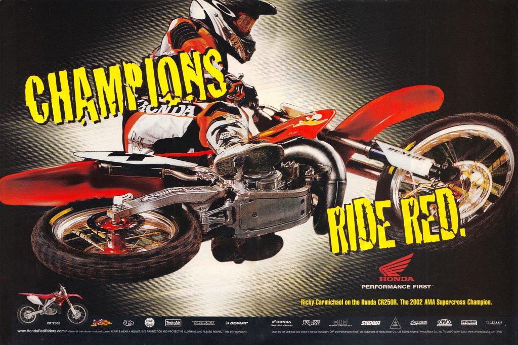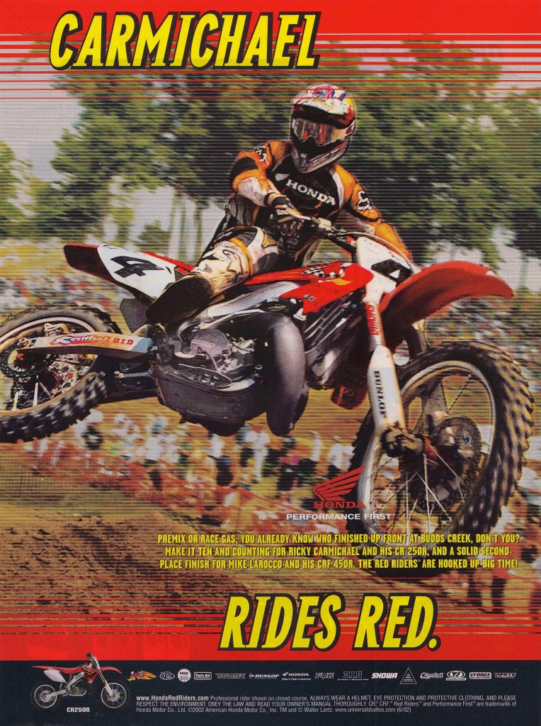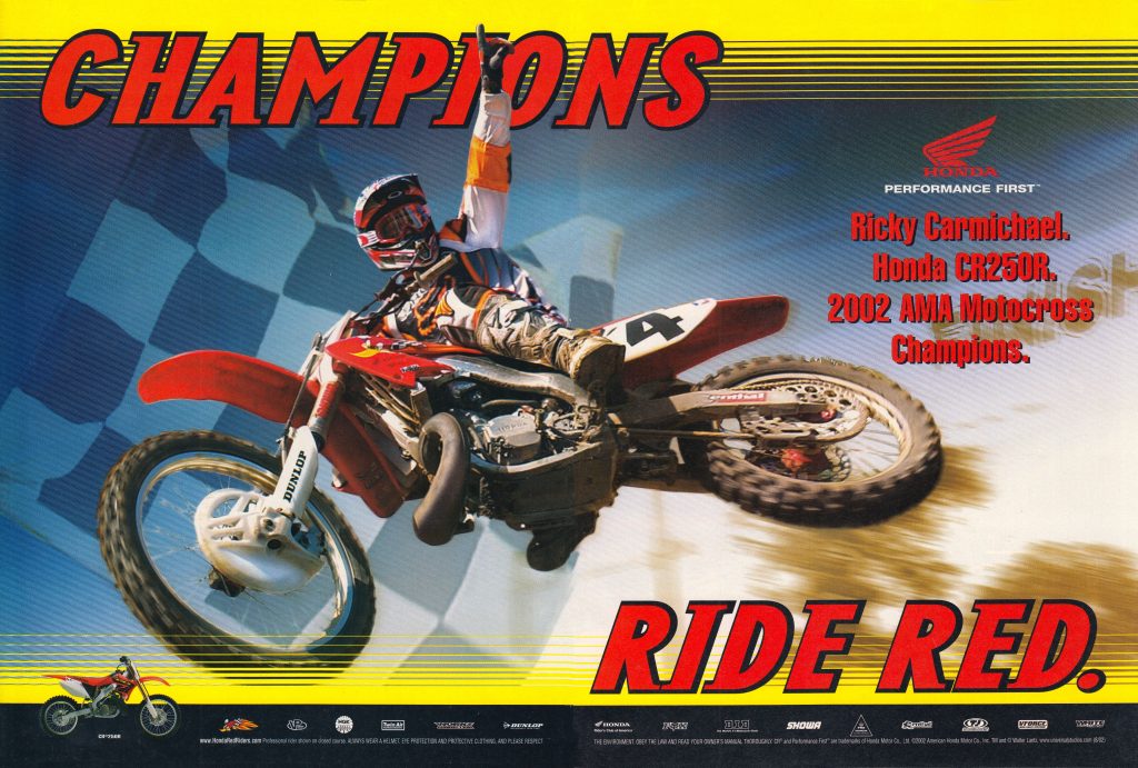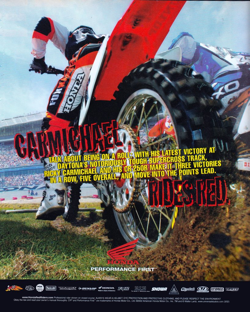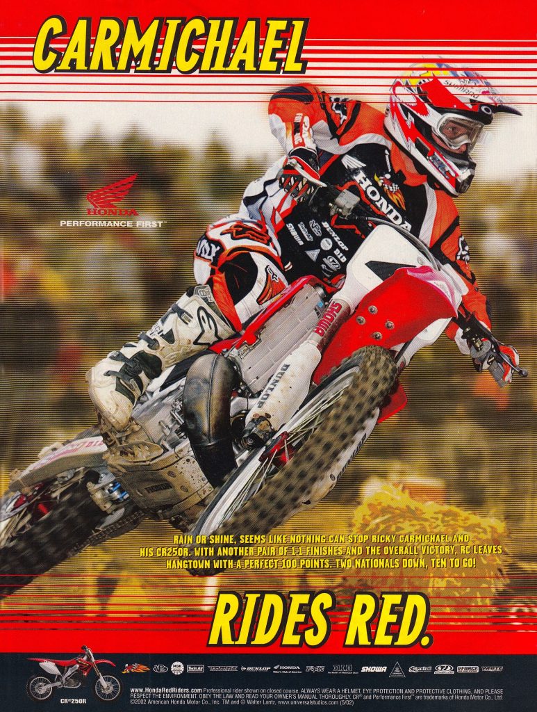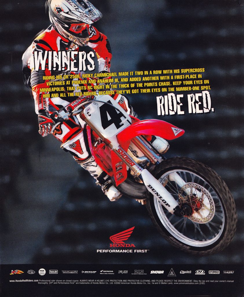 After another unsatisfactory season for Honda in 2001, it was time to hit the reset button for 2002. In a surprising move, Honda snatched reigning 250 Supercross and Motocross champion Ricky Carmichael away from Kawasaki. At the time, most fans thought RC bled green and it was downright shocking to see him move away from a brand that had delivered him so much success. Perhaps less surprising was the fan backlash, which centered around the feeling that Honda was “buying” titles by wooing RC away with a big payday. While some of that may have been true, RC also reportedly felt that Kawasaki was not doing enough to update their machines and he felt that Honda was more committed to developing their race machines. While both of these viewpoints probably held some truth, the reality was that Honda was ready to pay some serious money to have a six-time AMA champion under the red tent for 2002.