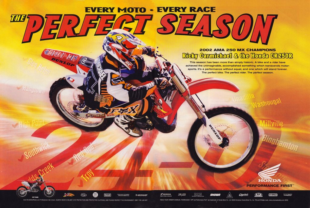 Before 2002, many riders thought the perfect season was a near impossibility. Twenty-four motos without a serious crash, mechanical mishap, or even a first-turn fall. Even the fastest rider in the world was bound to have something go amiss, but in 2002 Ricky Carmichael proved that it could be done. Much like the unbreakable four-minute mile barrier, once that ceiling was chattered, others followed. Still, no one can ever discount just what RC did in 2002. His incredible domination this season was history-making and a tribute to the immense determination of one the greatest motocross riders the sport has ever seen. Photo Credit: Honda