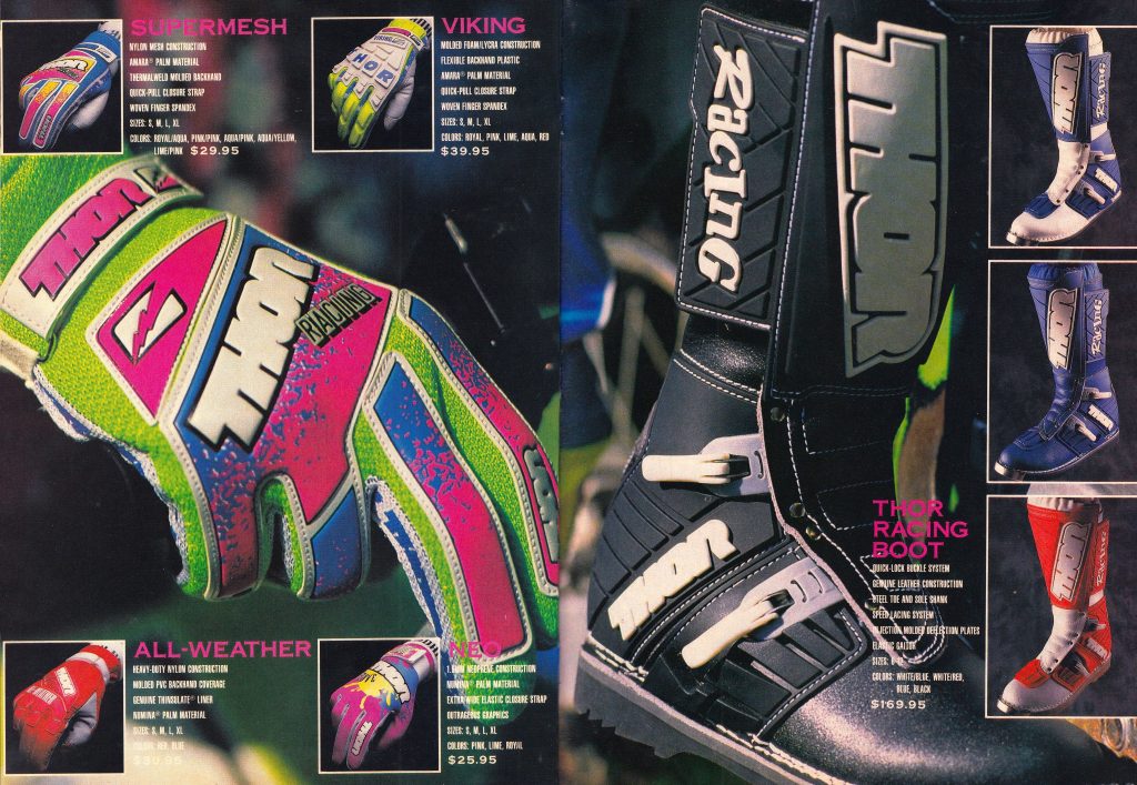 Compared to today’s minimalist gloves these 1991 offerings look like Medieval suits of armor. Velcro on boots was all the rage in the late eighties and early nineties and I preferred its convenience over the seventies-era boots with 86 buckles to fiddle with. Photo Credit: THOR