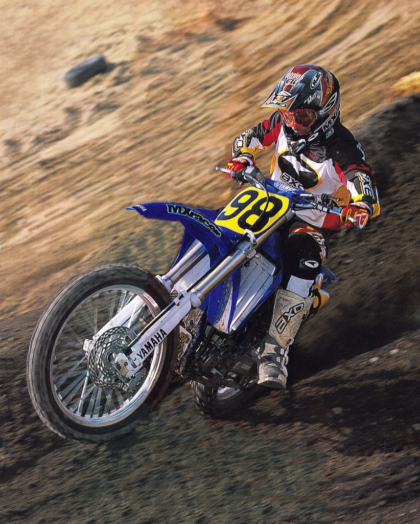 The updated KYB “bumper” forks for 2000 did an excellent job of taming the track and were much better controlled on hard hits than the year before. Bottoming remained an issue for fast guys, but the overall action was in the ballpark for most riders below the pro class. Photo Credit: Yamaha