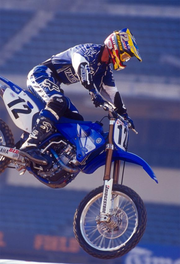 The YZ426F dropped two pounds for 2000, but it remained the plus-sized model of the Open Class. KTM’s new 520SX undercut it by fifteen pounds and every two-stroke it was likely to face bested it by at least twenty. While this weight disadvantage was not always an issue, it was impossible to ignore if the YZ426F stepped out of line or got a bit too sideways in the air. While antics like this were possible, the YZ426F was not the hot setup for the X-Games crowd in 2000. Photo Credit: Ken Faught