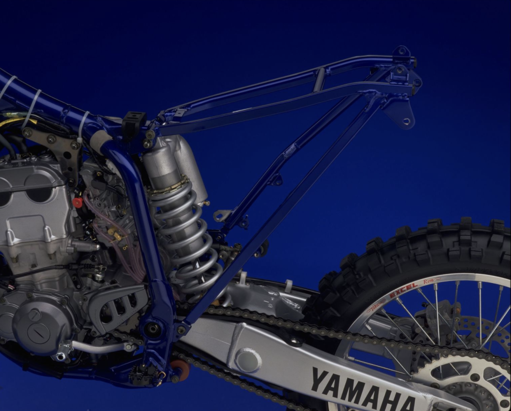 An all-new frame for 2000 repositioned the steering head, shortened the wheelbase, and improved the metallurgy for improved strength. A switch from steel to aluminum for the rear subframe shaved a few precious ounces from the notoriously corpulent YZ-F. Photo Credit: Yamaha