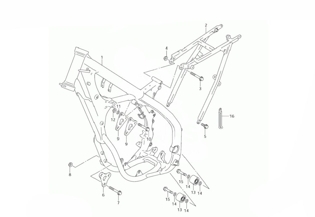 Underpinning the redesigned RM was an all-new frame that was stronger, lighter, and more compact than in 2000. The new frame remained crafted out of steel but featured an all-new layout that combined some of the features of a traditional and perimeter design. At the front, the redesigned frame was thoroughly conventional, with a large single backbone and single downtube that split into a dual cradle below the motor. Toward the rear of the backbone, however, the frame split and resembled a Kawasaki design with large, stamped steel spars on each side. This “semi-perimeter” configuration was engineered to provide a strong and flex-free feel while avoiding the wide steering head and midsection that plagued Honda and Kawasaki’s early perimeter frame designs.